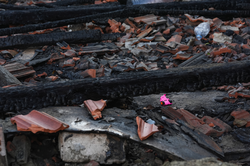 Yangının söndürüldüğü evin bahçesinde çocuklara ait oyuncaklar ve ailenin bakımını üstlendiği bir köpeğin bulunduğu görüldü.