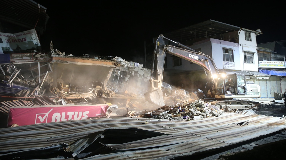 Enkaz kaldırma esnasında tehlike oluşturan binalar da kontrollü şekilde yıkılıyor.