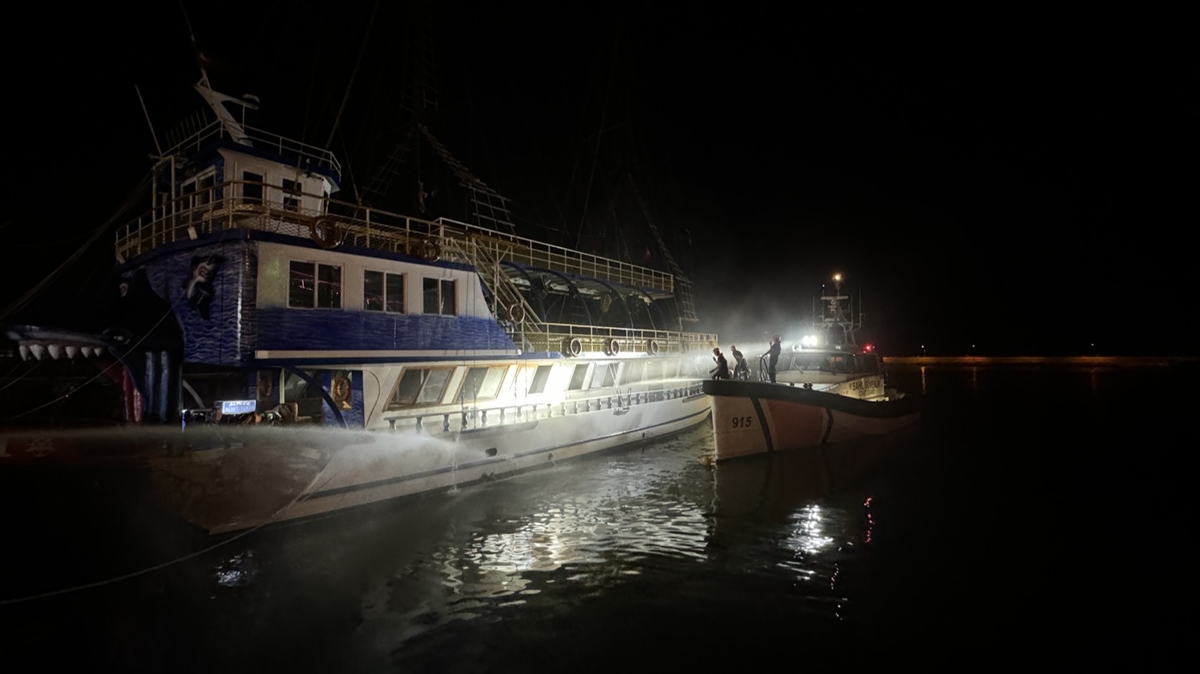 Alanya Balıkçı Barınağı'nda demirli tur teknesinin bar ve motor kısmında henüz belirlenemeyen nedenle yangın çıktı.
