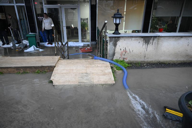 Su birikintileri ve sel nedeniyle sürücü ve vatandaşlar yol ile kaldırımlarda ilerlemekte zorlanırken, esnaf ise işletmelerine giren suları tahliye etti.