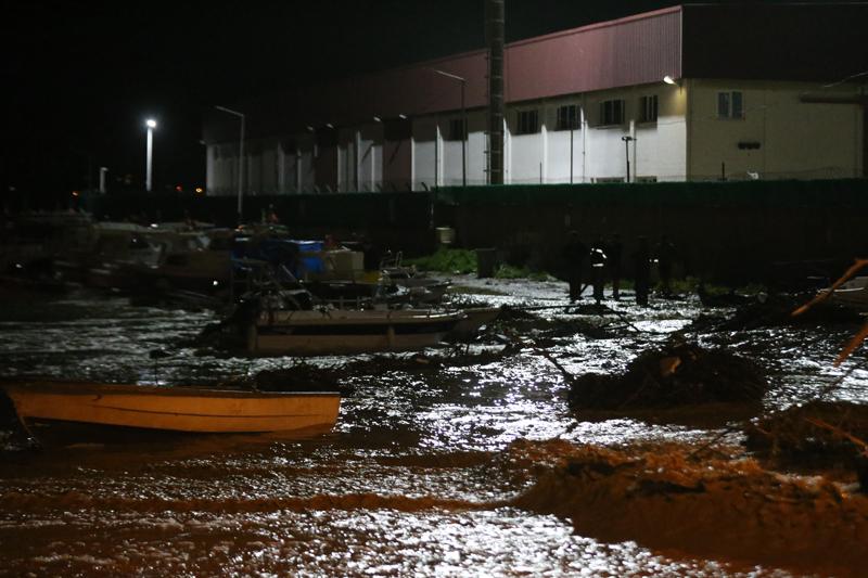 Güçlü su akışıyla taşan çay, balıkçı barınağına doğru ilerledi. Burada bulunan bazı tekneler taşkından zarar görürken mal sahipleri teknelerinin halatlarını güçlendirdi.