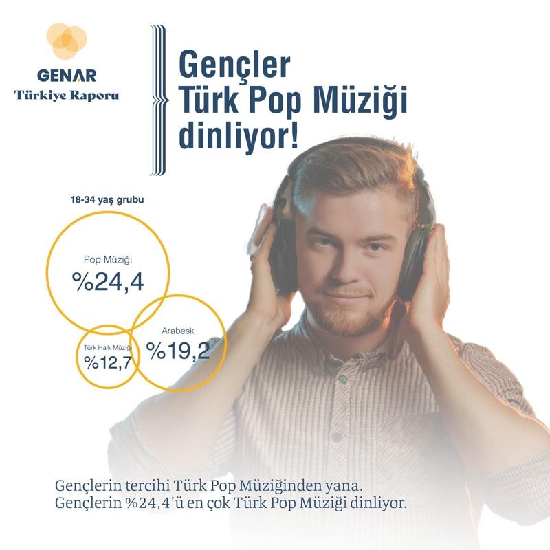 Araştırmaya katılan gençlerin tercihi ise Türk Pop Müziğinden yana. Gençlerin %24,4'ü en çok Türk Pop Müziği dinliyor. Orta yaş grubunda ise en çok tercih edilen müzik türleri arasında Arabesk ilk tercihler arasında yer alıyor. Türk Halk müziği ise özellikle 55 yaş üstü grubunun en çok dinlediği müzik türü olarak öne çıkıyor.