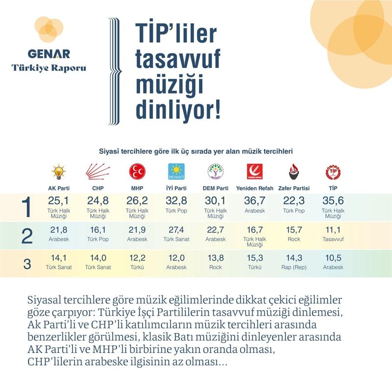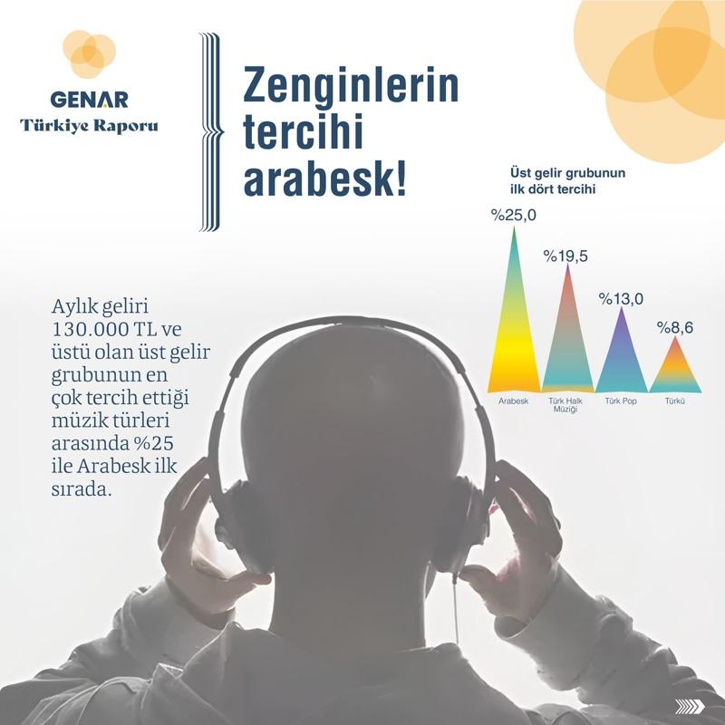 Genar Türkiye Raporu'nun Ocak ayı araştırmasında Türkiye'de en çok dinlenen müzik türleri soruldu. Araştırmada ilginç veriler dikkat çekti. Üst gelir gruplarında Arabesk en çok dinlenilen müzik olmanın yanı sıra Tasavvuf müziği dinleyenler arasında TİP'liler ön plana çıktı. AK Parti'li ve MHP'lilerin Klasik Batı müziğini CHP'lilerden daha fazla dinlediğini belirtmesi araştırmadan çıkan ilginç sonuçlardan.