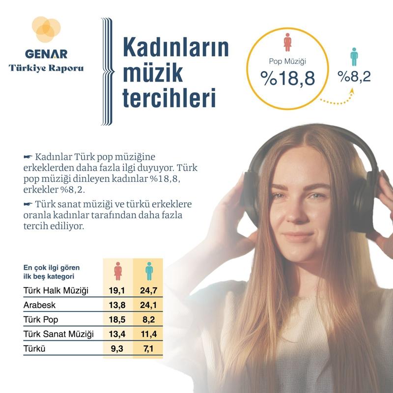 Araştırmaya katılan kadınların Türk pop müziğine erkeklere oranla daha fazla ilgi duydukları görülüyor. Türk pop müziği dinlediğini belirten kadınların oranı %18,8 iken bu oran erkeklerde %8,2. Kadınların Türk Sanat Müziği ve Türkü'yü erkeklere oranla daha çok tercih ettiği ayrıca ortaya çıkan sonuçlar arasında.