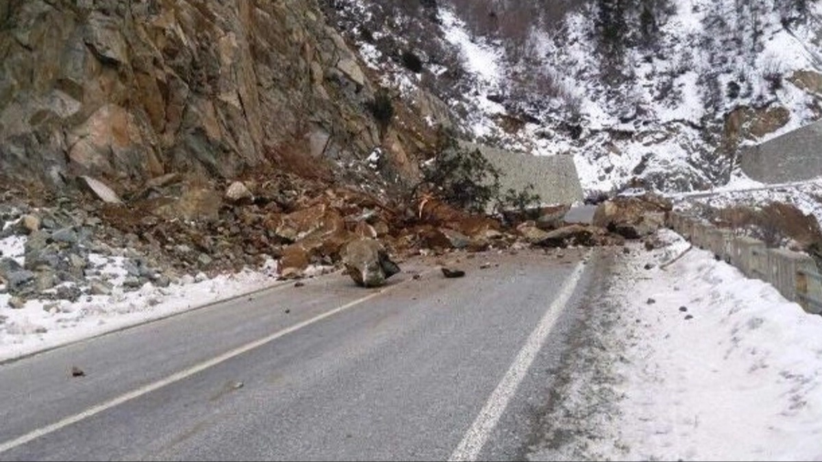 Kara yolunun 18. kilometresindeki Varyant mevkisinde, yamaçlardan kopan kaya kütlesi ve toprak yola sürüklendi.