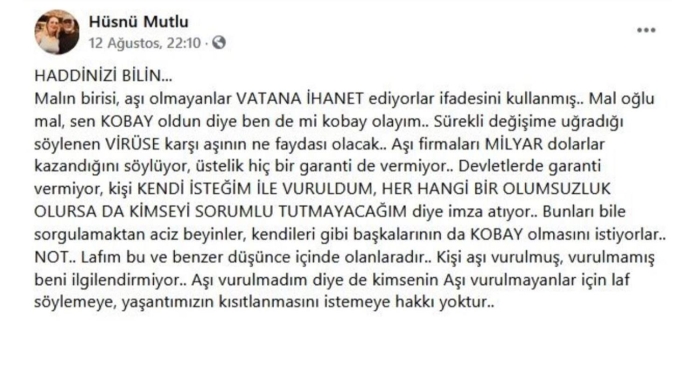 Koronavirüs tedavisi gören Hüsnü Mutlu'nun 12 Ağustos tarihinde sosyal medya hesabından yaptığı paylaşımlar dikkat çekti. Aşı olan kişilere 'kobay' ve 'mal' diye hitap eden ve aşı vurulmanın faydasız olduğunu iddia eden Mutlu paylaşımında şu ifadelere yer vermişti: "Haddinizi bilin. Malın birisi, aşı olmayanlar vatana ihanet ediyorlar ifadesini kullanmış. Mal oğlu mal, sen kobay oldun diye ben de mi kobay olayım. Sürekli değişime uğradığı söylenen virüse karşı aşının ne faydası olacak. Aşı firmaları milyar dolarlar kazandığını söylüyor, üstelik hiçbir garanti de vermiyor. Devletler de garanti vermiyor, kişi kendi isteğim ile vuruldum, herhangi bir olumsuzluk olursa da kimseyi sorumlu tutmayacağım diye imza atıyor. Bunları bile sorgulamaktan aciz beyinler, kendileri gibi başkalarının da kobay olmasını istiyorlar. Not. Lafım bu ve benzer düşünce içinde olanlaradır. Kişi aşı vurulmuş, vurulmamış beni ilgilendirmiyor. Aşı vurulmadım diye de kimsenin aşı vurulmayanlar için laf söylemeye, yaşantımızın kısıtlanmasını istemeye hakkı yoktur."