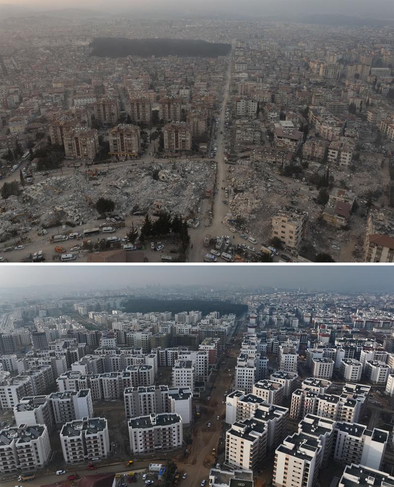 Hatay'da 6 Şubat 2023'te meydana gelen depremlerdeki yıkımın fotoğraf ve videoları ile afetin üçüncü yılında aynı açıyla havadan kayda alınan görsellerin birleşimi, şehirde inşa çalışmalarında gelinen noktayı ortaya koydu.