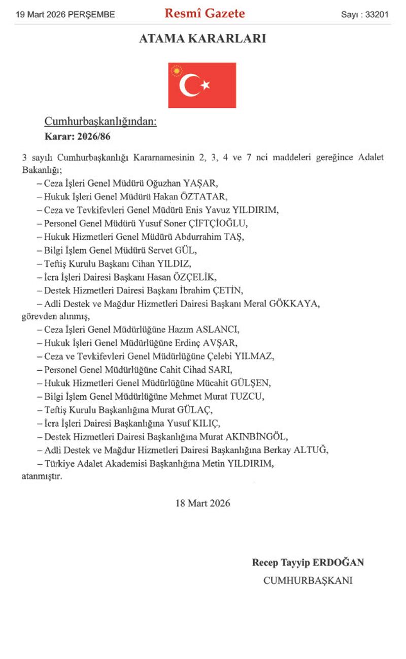 Cumhurbaşkanı Recep Tayyip Erdoğan'ın imzasıyla yayımlanan kararlara göre, Adalet Bakanlığında, Ceza İşleri Genel Müdürü Oğuzhan Yaşar, Hukuk İşleri Genel Müdürü Hakan Öztatar, Ceza ve Tevkifevleri Genel Müdürü Enis Yavuz Yıldırım, Personel Genel Müdürü Yusuf Soner Çiftçioğlu, Hukuk Hizmetleri Genel Müdürü Abdurrahim Taş, Bilgi İşlem Genel Müdürü Servet Gül, Teftiş Kurulu Başkanı Cihan Yıldız, İcra İşleri Dairesi Başkanı Hasan Özçelik, Destek Hizmetleri Dairesi Başkanı İbrahim Çetin, Adli Destek ve Mağdur Hizmetleri Dairesi Başkanı Meral Gökkaya görevden alındı.
