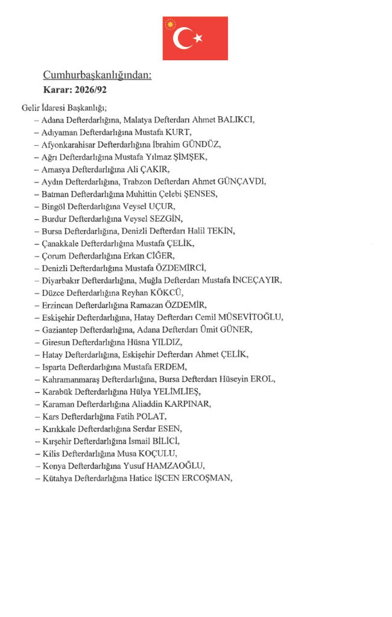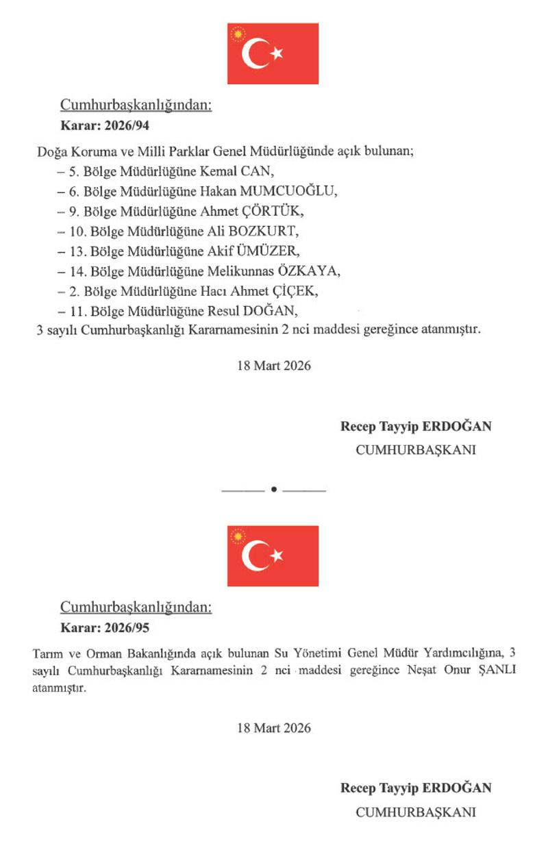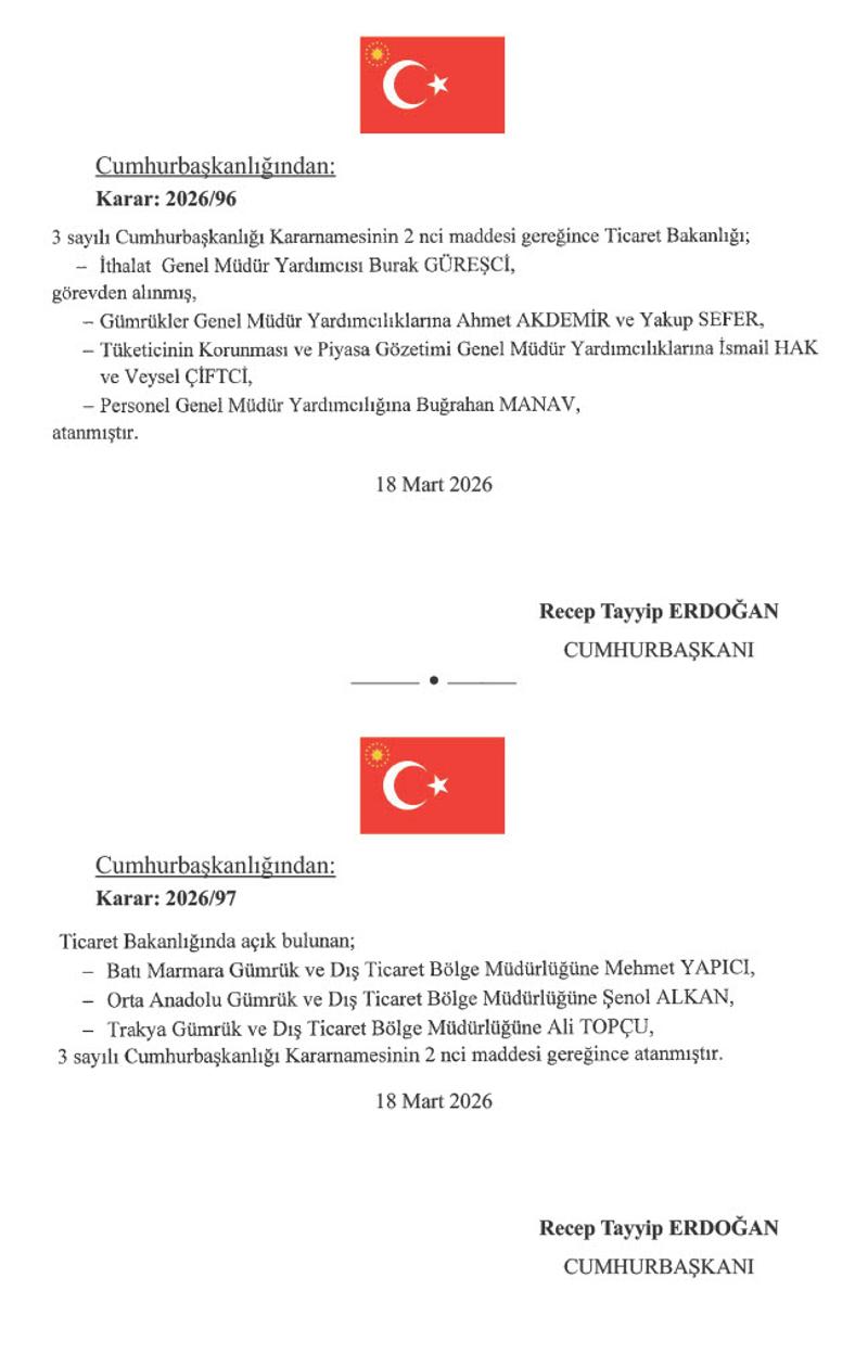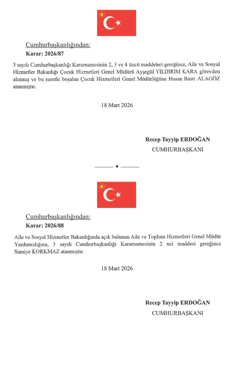 Kararlara göre, Aile ve Sosyal Hizmetler Bakanlığında Çocuk Hizmetleri Genel Müdürü Ayşegül Yıldırım Kara görevden alınırken, yerine Hasan Basri Alagöz atandı. Bakanlığın Aile ve Toplum Hizmetleri Genel Müdür Yardımcılığına ise Samiye Korkmaz getirildi.