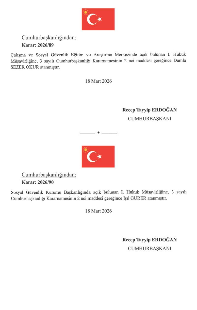 Çalışma ve Sosyal Güvenlik Eğitim ve Araştırma Merkezinde açık bulunan Birinci Hukuk Müşavirliğine Damla Sezer Okur getirilirken, Sosyal Güvenlik Kurumu Başkanlığında açık bulunan Birinci Hukuk Müşavirliğine Işıl Gürer atandı.