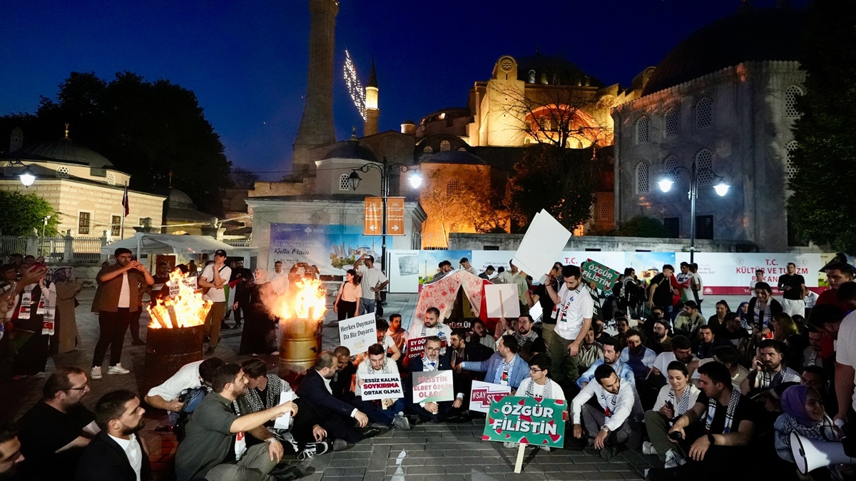 Ayasofya-i Kebir Cami-i Şerifi'nde akşam namazını kılan gençler, ardından tekbirlerle meydanda bir araya geldi. Grup 'Müslüman zulme boyun eğmez, 'Sessiz kalma soykırıma ortak olma', 'Ey dünya daha kaç çocuk ölmeli', 'Filistin elbet özgür olacak', 'Her yer Filistin her yer Gazze', 'İsrail savaş suçlusudur' yazılı pankartlar taşıdı.