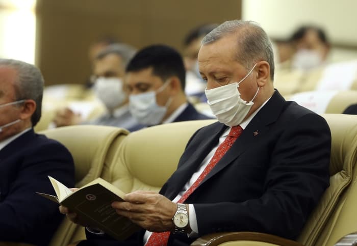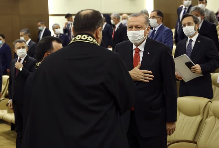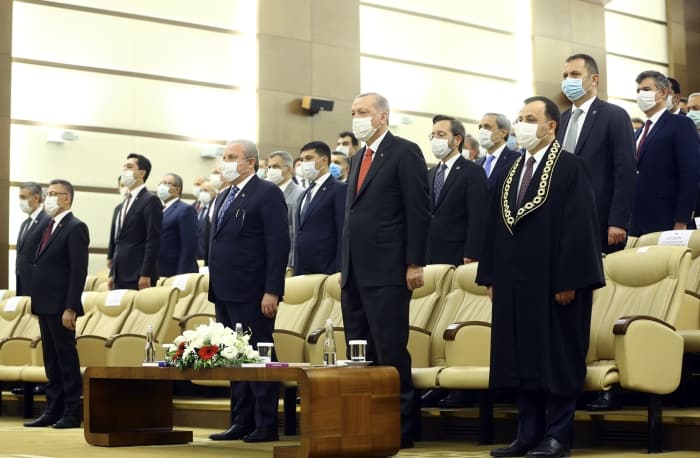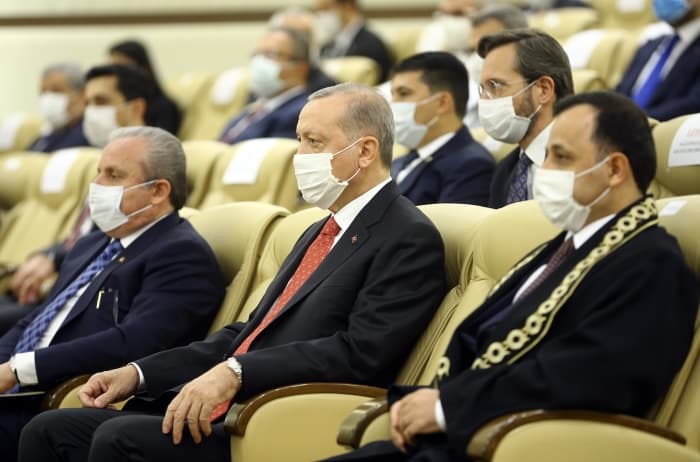 Toplantıya Cumhurbaşkanı Erdoğan, TBMM Başkanı Mustafa Şentop, Adalet Bakanı Abdulhamit Gül ve CHP Genel Başkanı Kemal Kılıçdaroğlu katılıyor. Toplantıda liderler koronavirüse karşı maske takarken, sosyal mesafe kuralına uygun şekilde oturması dikkat çekti.