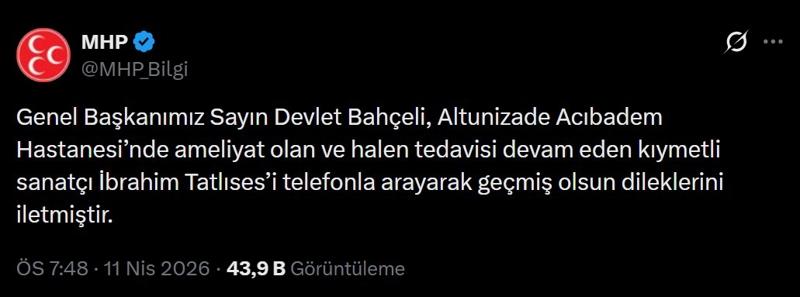 Milliyetçi Hareket Partisi'nin sosyal medya hesabından yapılan açıklamada, "Genel Başkanımız Sayın Devlet Bahçeli, Altunizade Acıbadem Hastanesi'nde ameliyat olan ve tedavisi devam eden kıymetli sanatçı İbrahim Tatlıses'i telefonla arayarak geçmiş olsun dileklerini iletmiştir" ifadelerine yer verildi.