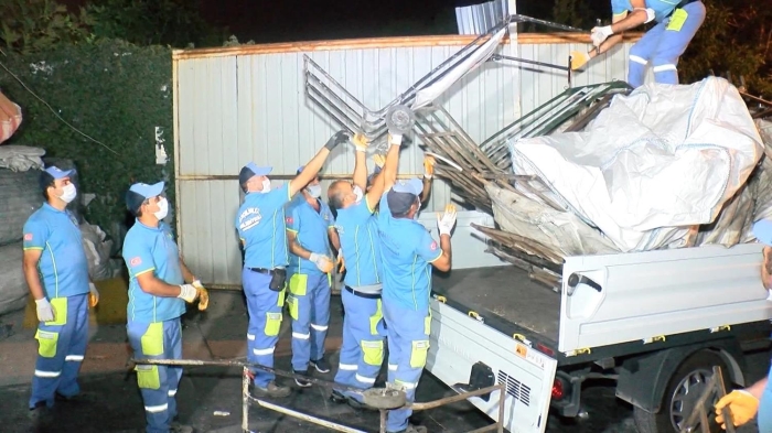 İş yerlerinde yapılan aramalarda ise kağıt ve katı atık toplamada kullanılan çok sayıda çek çek bulundu. El konulan çek çekler, belediye işçileri tarafından kamyonlara yüklenerek götürüldü.
