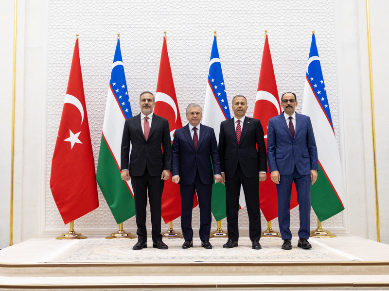 Dışişleri Bakanı Hakan Fidan, beraberinde İçişleri Bakanı Ali Yerlikaya ve Milli İstihbarat Teşkilatı Başkanı İbrahim Kalın ile Taşkent'e yaptığı ziyaret kapsamında, Özbekistan Cumhurbaşkanı Şevket Mirziyoyev ile görüştü. Görüşmenin ardından kameralar karşısına geçen Bakan Fidan, ""Bu gerçekten çok önemli bir ziyaretti. Sayın Mirziyoyev'in Haziran ayında Türkiye'ye yaptığı ziyarette Cumhurbaşkanımız ile almış olduğu kararların takibi için yapılan bir ziyaretti. Bu formatta Türkiye-Özbekistan makamları ilk defa bir araya geliyor. Ben Dışişleri Bakanı olarak yanımda İçişleri Bakanı ve MİT Başkanı arkadaşlarımızla beraber buraya geldik" dedi.