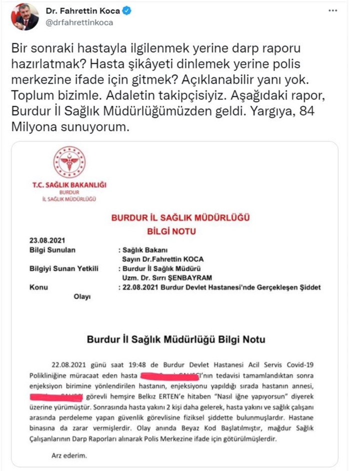 Bakan Koca, dün akşam Burdur'da çocuklarına enjeksiyon yaptırmak için hastaneye gelen ailenin, acil servisteki hemşirelere ve güvenlik görevlilerine saldırdığı olaya ilişkin Twitter hesabından açıklama yaptı. Bakan Koca paylaşımında, olayla ilgili Burdur İl Sağlık Müdürlüğü'nden kendisine gelen bilgi notunu da paylaşarak, "Bir sonraki hastayla ilgilenmek yerine darp raporu hazırlatmak? Hasta şikâyeti dinlemek yerine polis merkezine ifade için gitmek? Açıklanabilir yanı yok. Toplum bizimle. Adaletin takipçisiyiz. Aşağıdaki rapor, Burdur İl Sağlık Müdürlüğü'müzden geldi. Yargıya, 84 milyona sunuyorum" dedi.