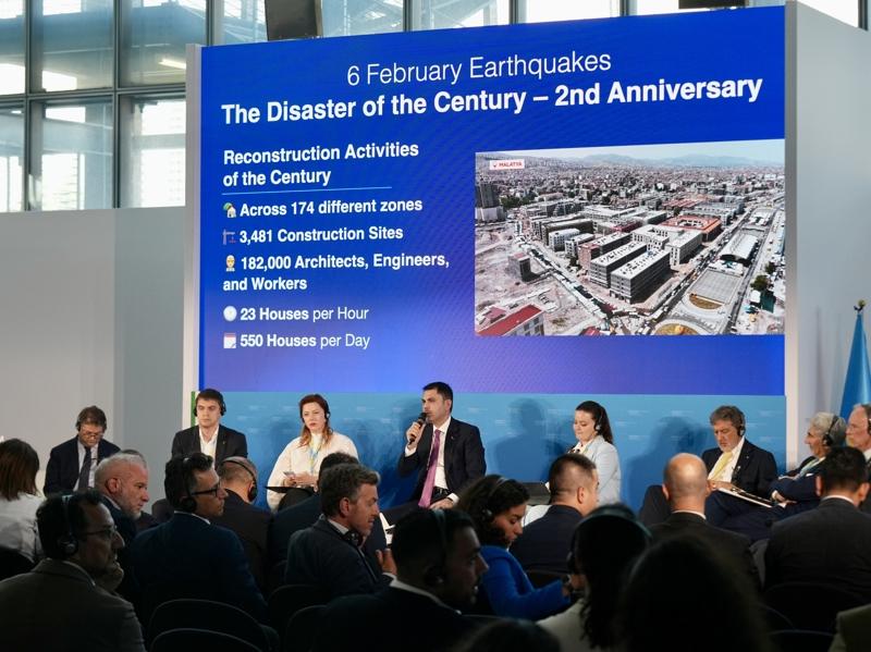 Bakan Kurum, aralarında İtalya, Almanya, Ukrayna ve Polonya gibi ülkelerin temsilcilerinin de olduğu panelde 11 ilde inşa edilen yeni afet konutlarının görüntülerinin, alt yapı çalışmalarına ilişkin verilerin ve mühendislik gücünün İngilizce tanıtım filmi eşliğinde sunum yaptı: Biz de 11 ilimizde, 14 milyon vatandaşımızı etkileyen bir depremi yaşadık. 50 bini aşkın canımızı yitirdiğimiz bu depremden hemen sonra bölgenin ihtiyaçları, iklim şartları, bilim insanları ve mühendislerimizin önerileri doğrultusunda bir çalışma başlattık. 15'inci günde bir taraftan enkazlar kaldırılırken diğer taraftan ilk konutlarımızın temellerini attık. 45'inci günde ilk konutlarımızı teslim ettik. Ve bugün 11 ilde 172 ayrı alanda 3 bin 481 şantiyede çalışıyoruz. 182 bin mimar, mühendis, işçi kardeşimizle birlikte saatte 23, günde 550 konut üretiyoruz. Bu gerçekten çok çok önemli bir başarı. 7 gün 24 saat seferberlik anlayışıyla arkadaşlarımız bu çalışmayı yürütüyor. 500 bine yakın konutun inşasını eş zamanlı başlatıp 2 yılda 250 binini teslim ettik. Yıl sonunda tamamını teslim edeceğiz.