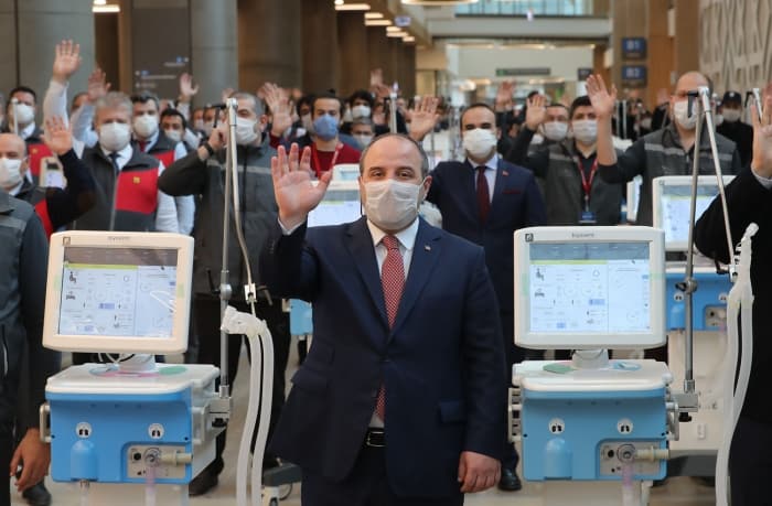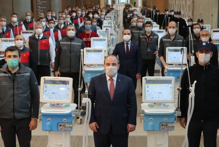 Nitekim bakanlığımızın destekleriyle kurulan Biosys isimli bir girişim firmasının bu alanda yaptığı çalışmalar, geliştirdiği bir ürün zaten vardı. Bu çalışmaları hızla seri üretime dönüştürmek için yerli firmalarımız bir milli seferberlik başlattı. Onlarca mühendis bir araya geldi, gece gündüz çalıştılar ve büyük bir özveriyle sadece 14 gün gibi kısa bir sürede seri üretim bandından ilk yerli ve milli yoğun bakım solunum cihazlarını indirdiler. Bugün testleri tamamlanmış ürünlerin bir kısmını Sağlık Bakanlığı'mıza teslim ediyoruz. İnşallah mayıs sonuna kadar 5 bin cihaz üretilmiş olacak. Tüm çabamız, sağlık çalışanlarımızın insanüstü emeklerine bir nebze de olsa katkı sağlamak."