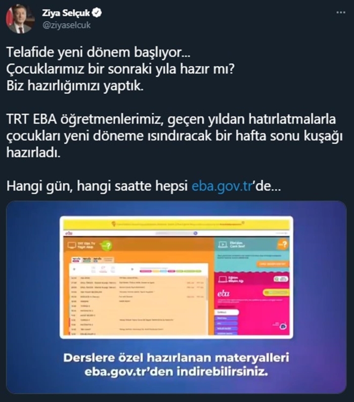 "Telafide yeni dönem başlıyor. Çocuklarımız bir sonraki yıla hazır mı? Biz hazırlığımızı yaptık. TRT EBA öğretmenlerimiz, geçen yıldan hatırlatmalarla çocukları yeni döneme ısındıracak bir hafta sonu kuşağı hazırladı. Hangi gün, hangi saatte hepsi http://eba.gov.tr'de."