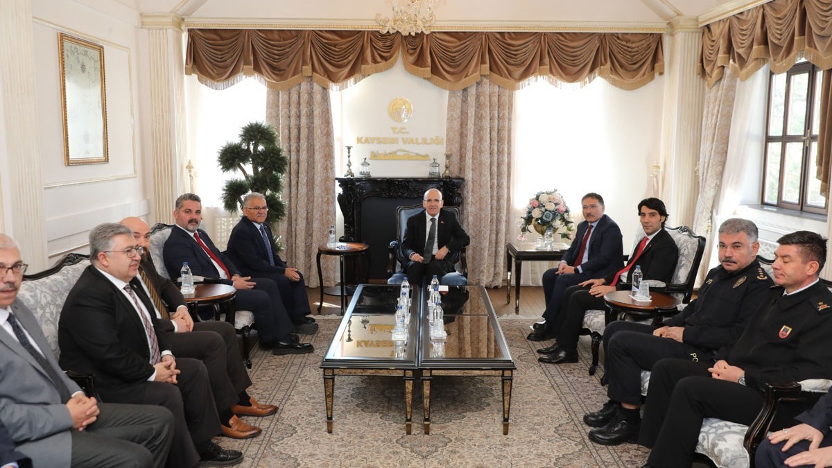 Vali Gökmen Çiçek'i Talas ilçesindeki çalışma ofisinde ziyaret eden Bakan Şimşek'i, Çiçek ile Büyükşehir Belediye Başkanı Memduh Büyükkılıç, İl Jandarma Komutanı Tuğgeneral Hakan Dedebağı, İl Emniyet Müdürü Kamil Karabörk ve protokol üyeleri karşıladı.