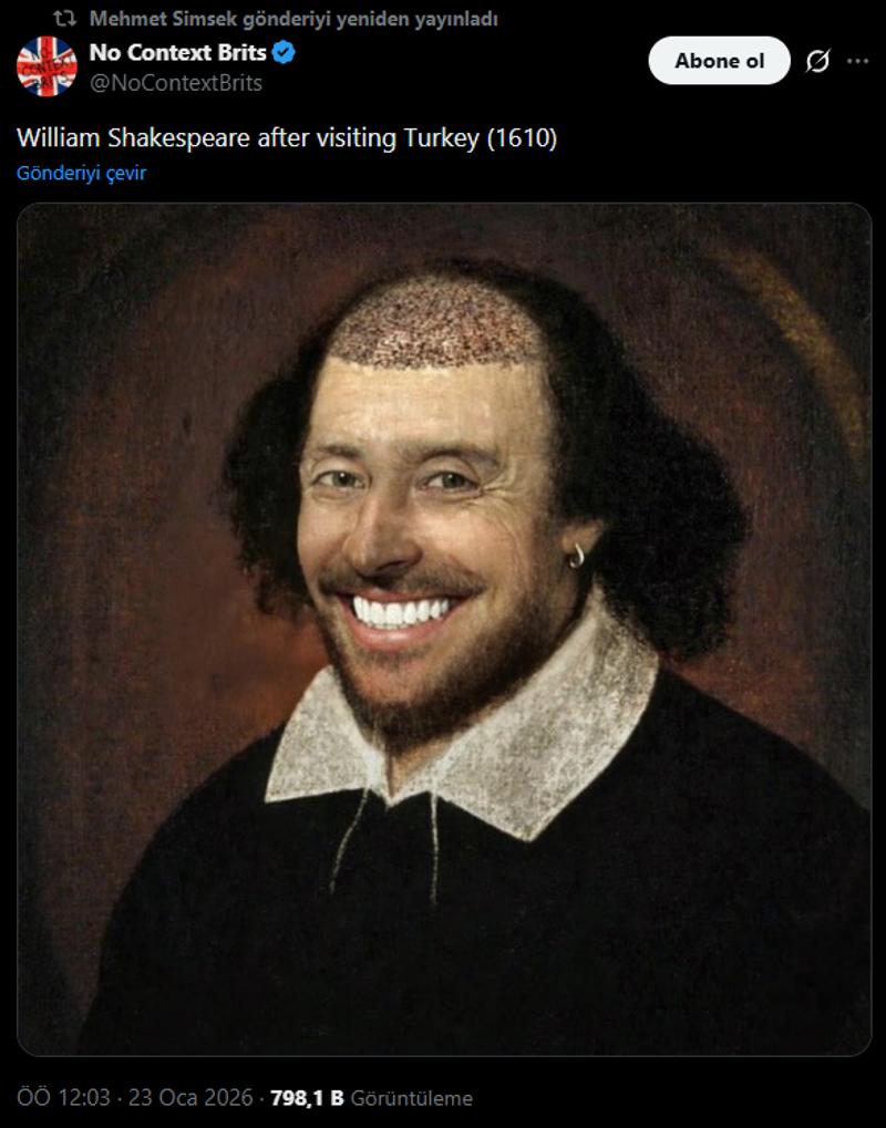 "No Context Brits" isimli hesaptan yapılan paylaşımda, ünlü yazar William Shakespeare'in görseli ile Türkiye'nin sağlık turizmine atıf yapılarak "William Shakespeare, Türkiye'yi ziyaret ettikten sonra (1610)" ifadeleriyle paylaşıldı. Paylaşılan görselde ise Shakespeare'in dişleri ve saçları dikkat çekti.