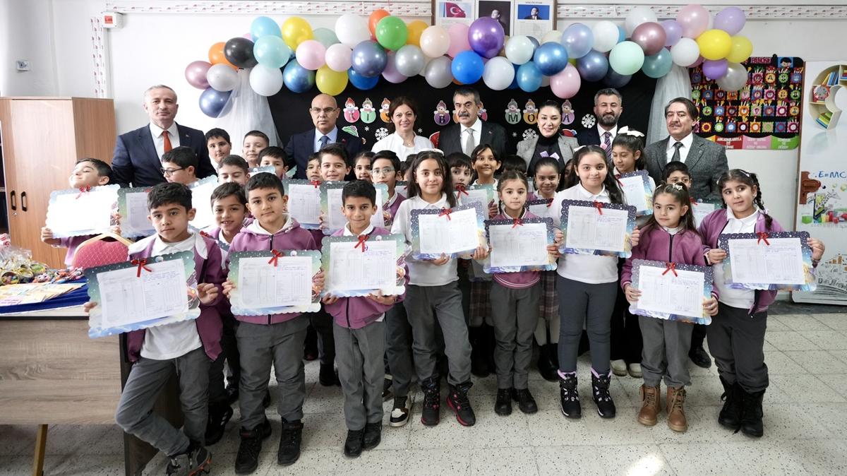 Öğrencilerle sohbet eden Tekin, sınıf öğretmenlerini ve çocukları tebrik edip karneleri dağıttı.