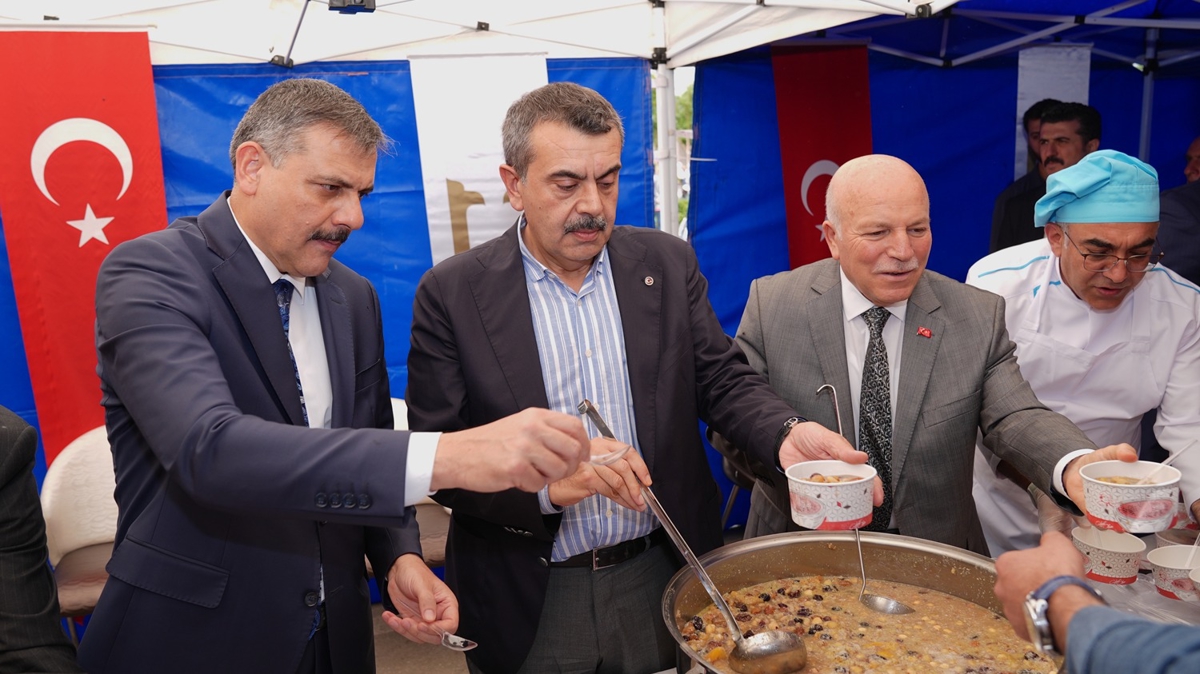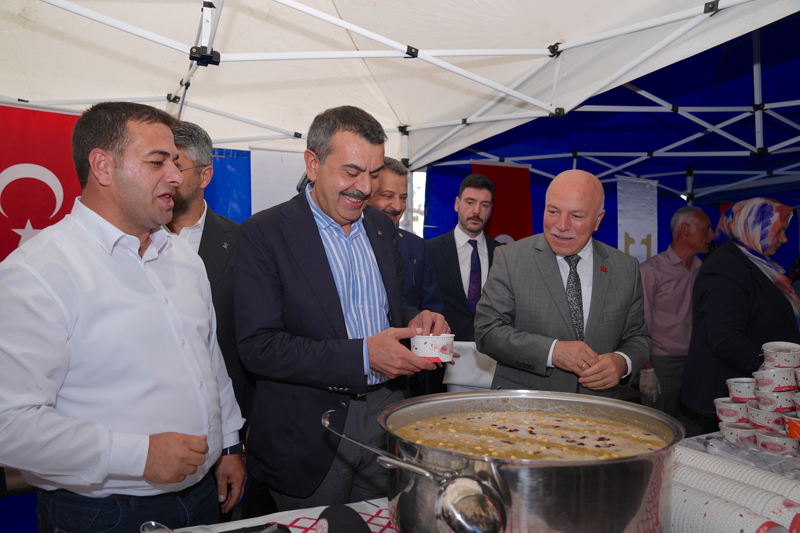 Çeşitli programlara katılmak üzere kentte bulunan Milli Eğitim Bakanı Yusuf Tekin de namazın ardından çadıra gelerek vatandaşlara doldurduğu aşureleri dağıttı.