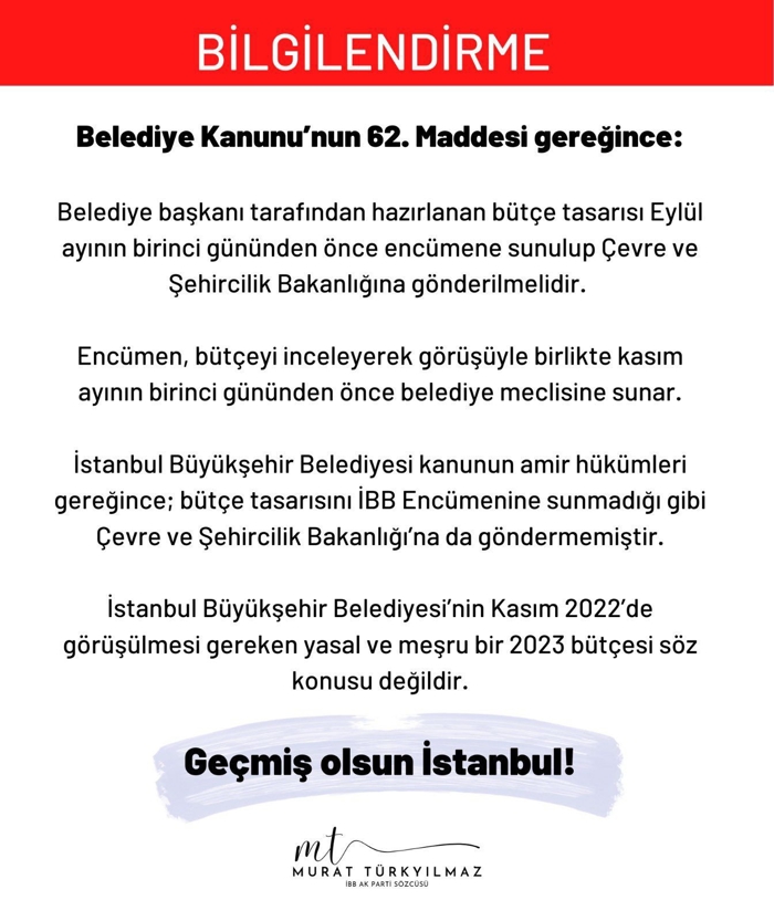 İBB Meclisi AK Parti Grup Sözcüsü Avukat Murat Türkylmaz: "Belediye Kanunun 62'nci maddesi gereğince Belediye Başkanı tarafından hazırlana bütçe tasarısı Eylül ayının 1'inci gününden önce encümene sunulup Çevre, Şehircilik ve İklim Değişikliği Bakanlığına gönderilmelidir. Encümen, bütçeyi inceleyerek görüşüyle birlikte Kasım ayının 1'inci gününden önce belediye meclisine sunar. İstanbul Büyükşehir Belediyesi kanunun amir hükmü hükümleri gereğince ; bütçe tasarısını İBB Encümenine sunmadığı gibi Çevre, Şehircilik ve İklim Değişikliği Bakanlığı'na da göndermemiştir. İstanbul Büyükşehir Belediyesi'nin Kasım 2022'de görüşülmesi gereken yasal ve meşru bir 2023 bütçesi söz konusu değildir. Geçmiş olsun"