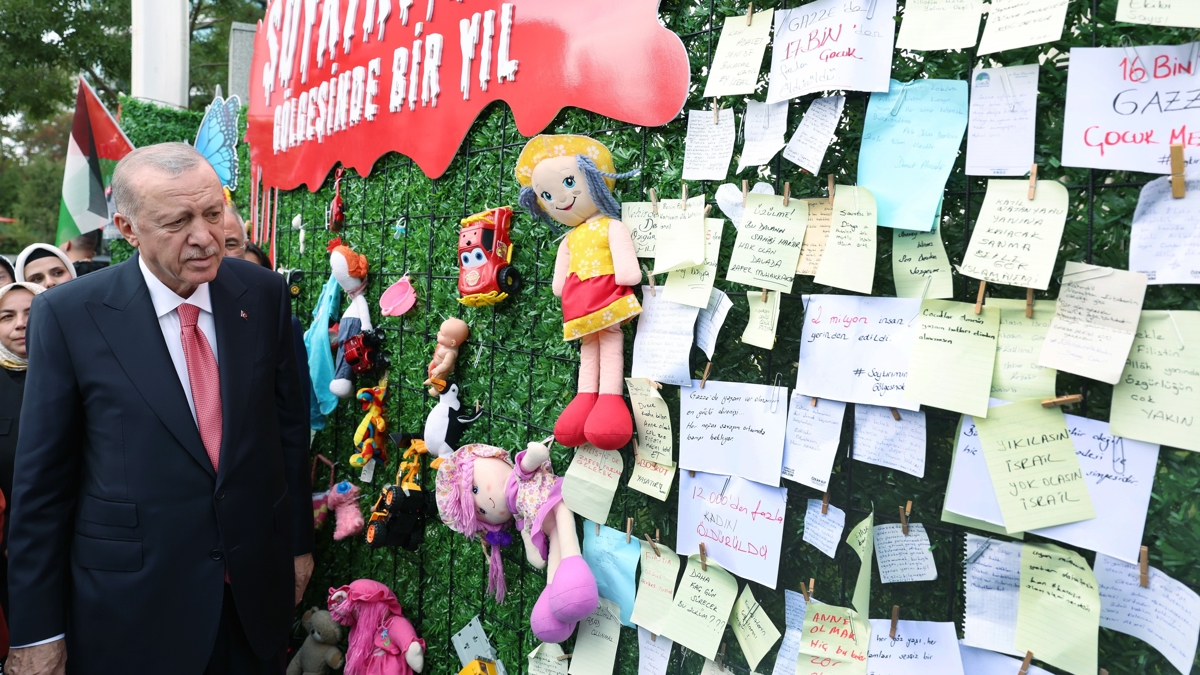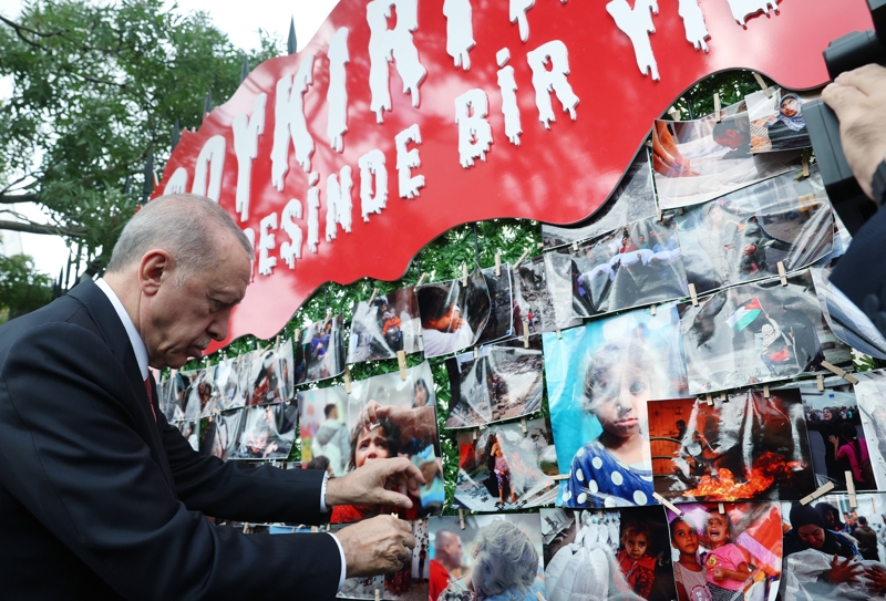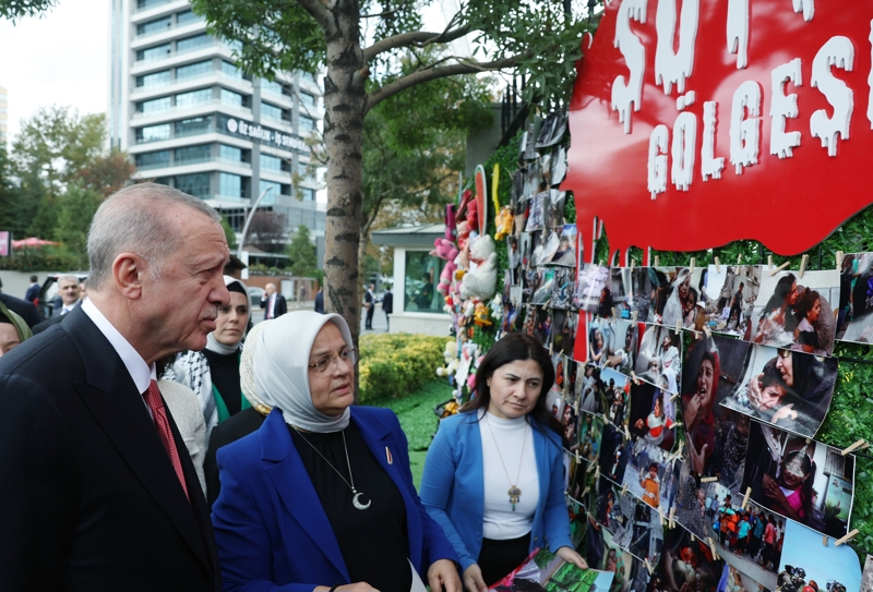 Genel Merkez Kadın Kolları Başkanı Ayşe Keşir'den etkinliğe ilişkin bilgi alan Erdoğan, İsrail'in saldırılarında yaralanan Filistinli kız çocuğunun fotoğrafını panoya astı.