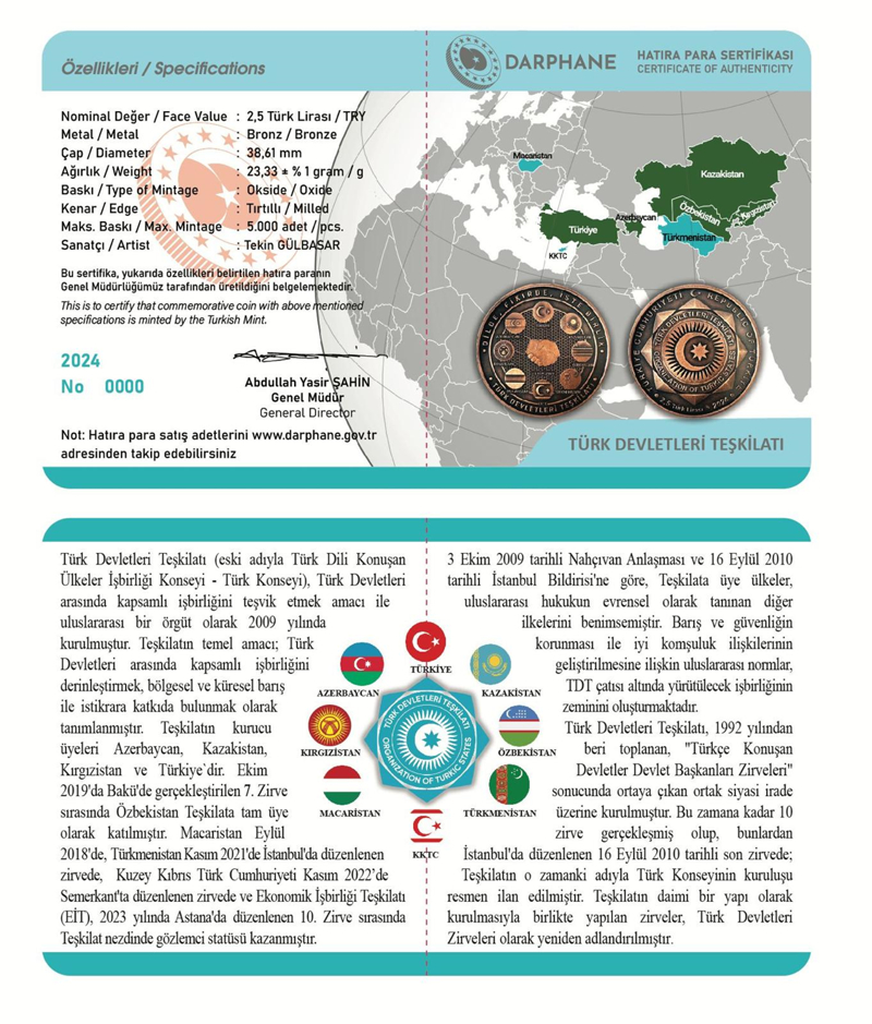 Hatıra paranın bir yüzünde ise Türk Devletleri Teşkilatı'nın bayrağı ve ismi ile kuruluş tarihi olan 3 Ekim 2009 ibaresi bulunuyor.