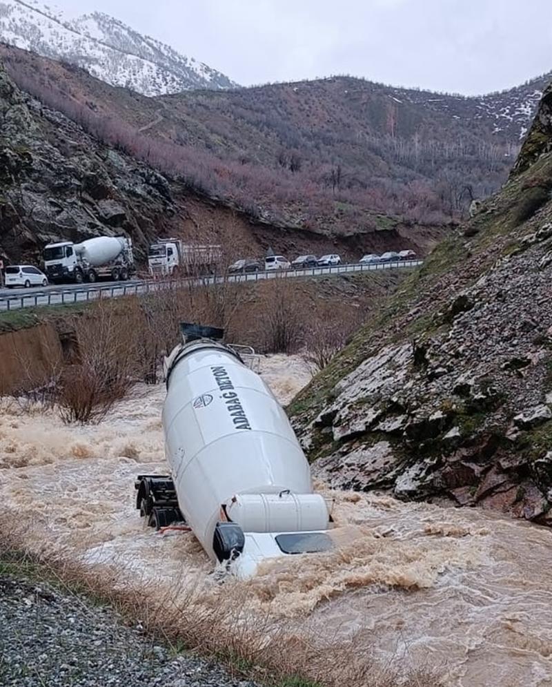itlis'in Tatvan ile Hizan ilçeleri arasındaki kara yolunda kontrolden çıkan beton mikseri dereye düştü, kaybolan sürücünün bulunması için çalışma başlatıldı.