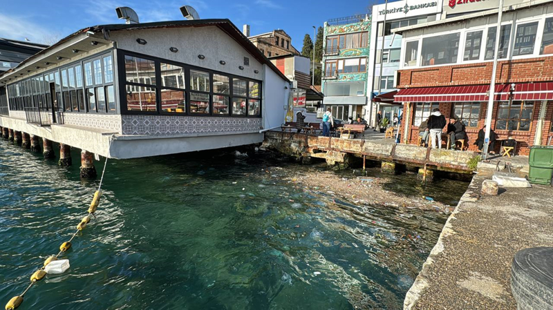 Deniz yüzeyinde çok sayıda yiyecek ambalajı, cam şişe ve teneke kutu gibi çöplerin yanı sıra evsel atıkların da olduğu görüldü.