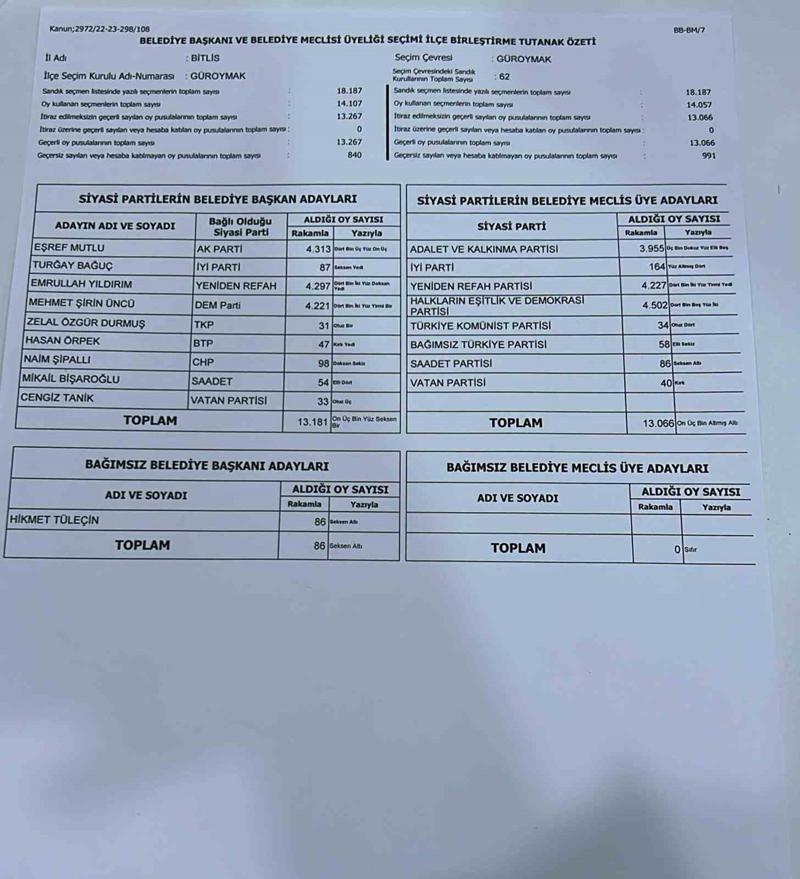 Bu sonuçlara göre Güroymak Belediye Başkanı AK Parti'nin adayı Eşref Mutlu oldu.