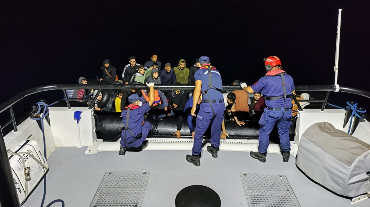 Bodrum açıklarında Yunanistan unsurlarınca Türk kara sularına itilen lastik bottaki 42 düzensiz göçmen karaya çıkarıldı.