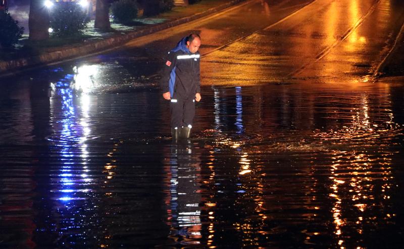 İhbar üzerine bölgeye sevk edilen belediye ekipleri, yoldaki suyu tahliye etmeye çalıştı.