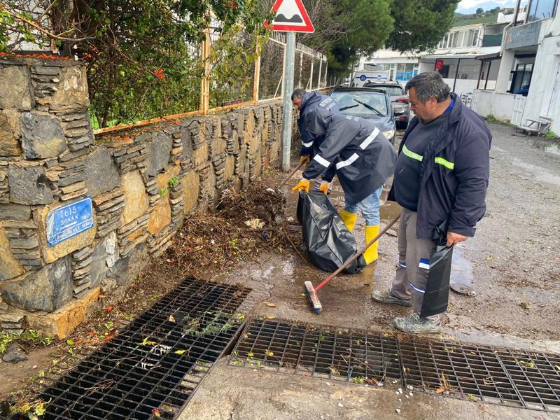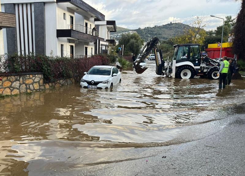 İlçeye yaklaşık 12 saatte metrekareye 44,2 kilogram yağış düşerken, belediye ekipleri Gümbet Mahallesi'nde vidanjör ve iş makineleri yardımıyla temizlik çalışması yaptı.