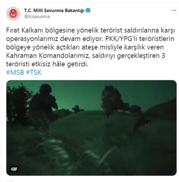 Türk Silahlı Kuvvetleri, Fırat Kalkanı bölgesine yönelik terörist saldırılarına karşı operasyonları sürdürüyor. Milli Savunma Bakanlığı'nın Twitter hesabından yapılan açıklamada, "Fırat Kalkanı bölgesine yönelik terörist saldırılarına karşı operasyonlarımız devam ediyor. PKK/YPG'li teröristlerin bölgeye yönelik açtıkları ateşe misliyle karşılık veren Kahraman Komandolarımız, saldırıyı gerçekleştiren 3 teröristi etkisiz hâle getirdi" denildi.
