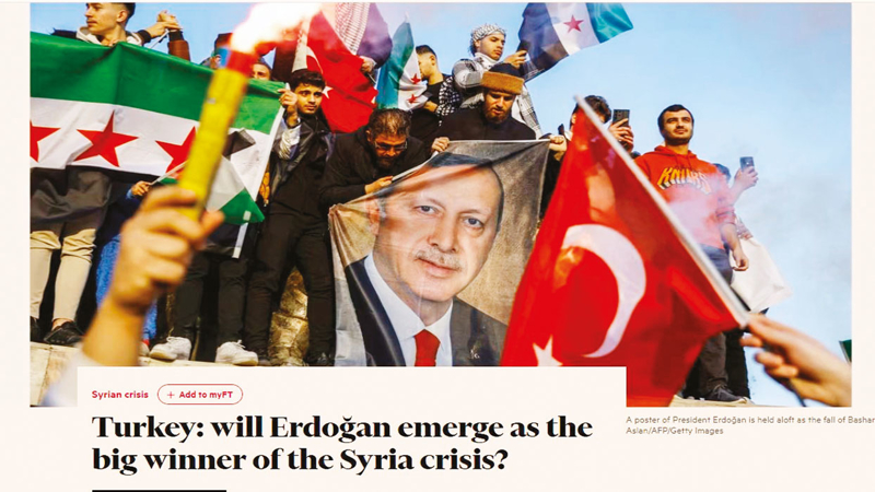 İngiliz Financial Times gazetesinde yayımlanan makalede, "Başkan Erdoğan, 13 yıldır kapısının önünde süren Suriye iç savaşının sonucu olarak yıllardır süren istikrarsızlık ve izolasyonla boğuştuktan sonra, Esad rejiminin devrilmesinden en büyük kazanç sağlayanlardan biri olabilir. Erdoğan, Ortadoğu'yu kasıp kavuran Arap ayaklanmaları dalgasının arkasında ağırlığını koydu. Birçok analist, Erdoğan'ın Esed'in devrilmesinin ardından ülkedeki en etkili yabancı aktör olarak yeni kazandığı konumdan siyasi ve ekonomik olarak kazanç sağlayacağına ikna olmuş durumda" ifadelerini yer verdi.