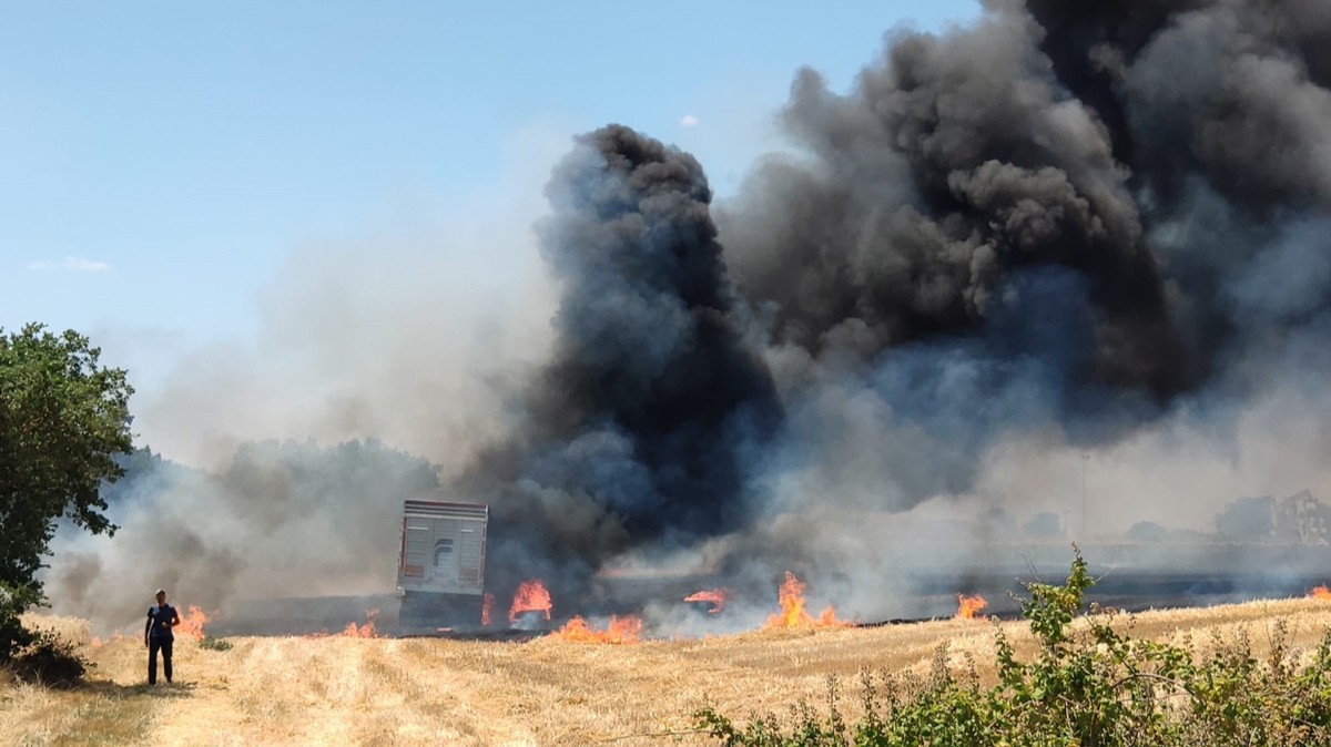 Buğdayın yüklendiği tırda henüz bilinmeyen nedenle yangın çıktı. Rüzgarın etkisiyle yangın anızlık alana da yayıldı.