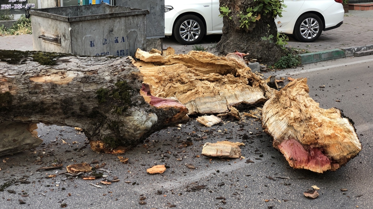 Altıparmak Caddesi'nde bulunan ve yaklaşık 200 yıllık olduğu tahmin edilen çınar ağacı, yola devrildi.