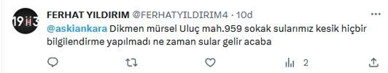 "Yenimahalle Çiğdemtepe bölgesinde iki gündür su yok kendimi kötü hissediyorum."