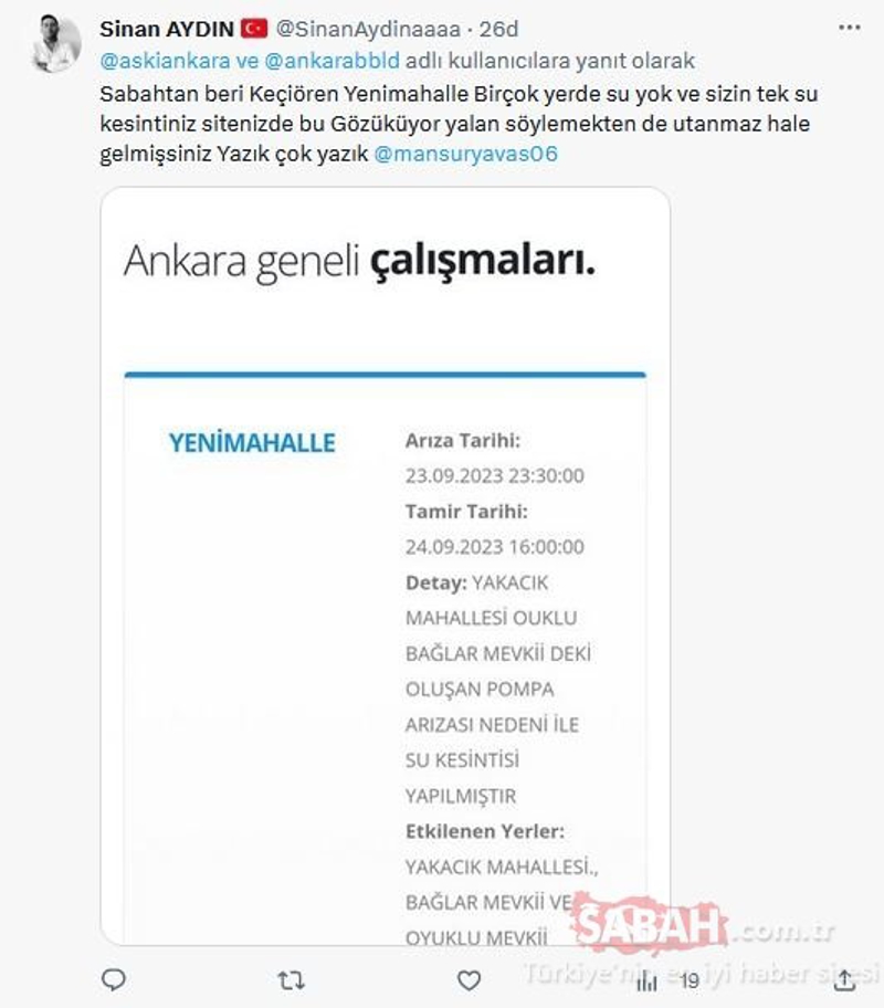 "Sabahtan beri Keçiören-Yenimahalle birçok yerde su yok ve sizin tek su kesintiniz sitenizde bu gözüküyor, yalan söylemekten de utanmaz hale gelmişsiniz. Yazık çok yazık..."