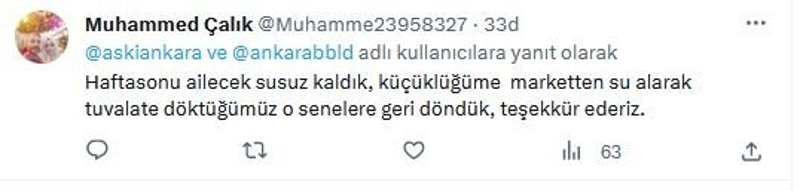 "Haftasonu ailecek susuz kaldık, küçüklüğüme, marketten su alarak tuvalete döktüğümüz o senelere geri döndük, teşekkür ederiz"