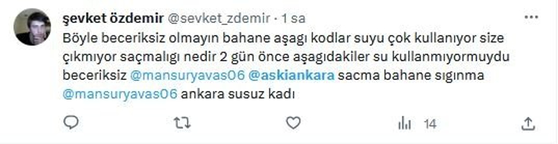 "Böyle beceriksiz olmayın bahane aşağı kodlar suyu çok kullanıyor size çıkmıyor saçmalığı nedir? 2 gün önce aşağıdakiler su kullanmıyor muydu? Beceriksiz Mansur Yavaş. Ankara susuz kaldı"