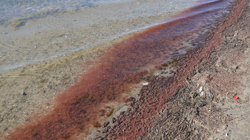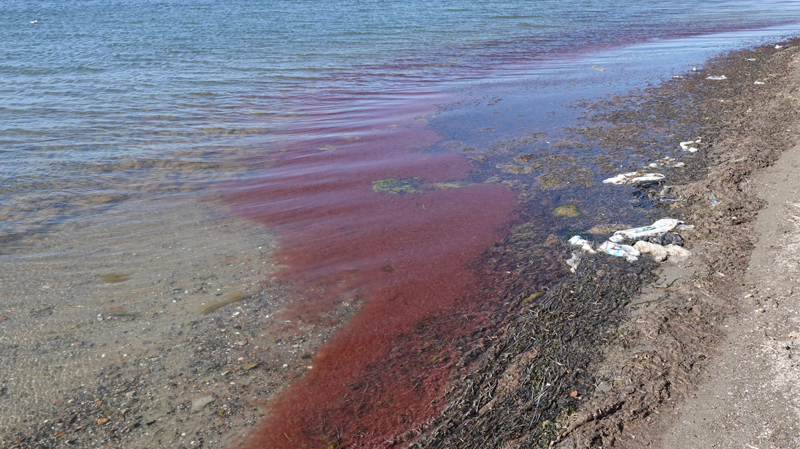 Bölgede iki gündür etkili olan fırtına nedeniyle kıyı kesimleri ile sahil bölgesi kırmızı alglerle kaplandı.