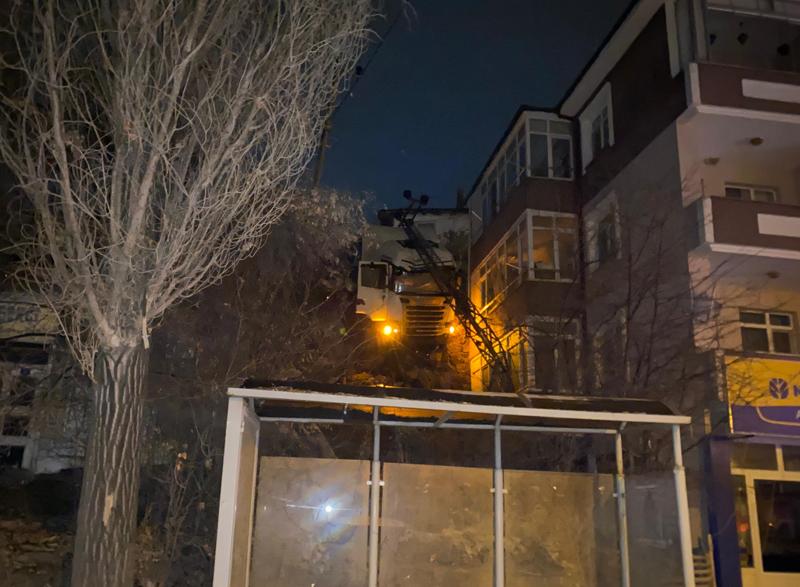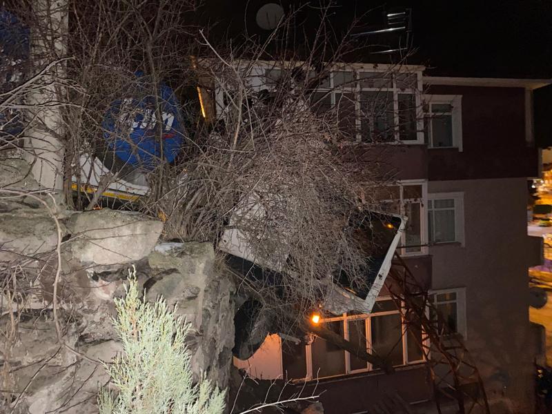 Kale Mahallesi İsmail Semerci Caddesi üzerinde kayganlaşan yolda kontrolden çıkan tır, binaya çarpmamak için yol kenarındaki boşluğa doğru manevra yaptı.