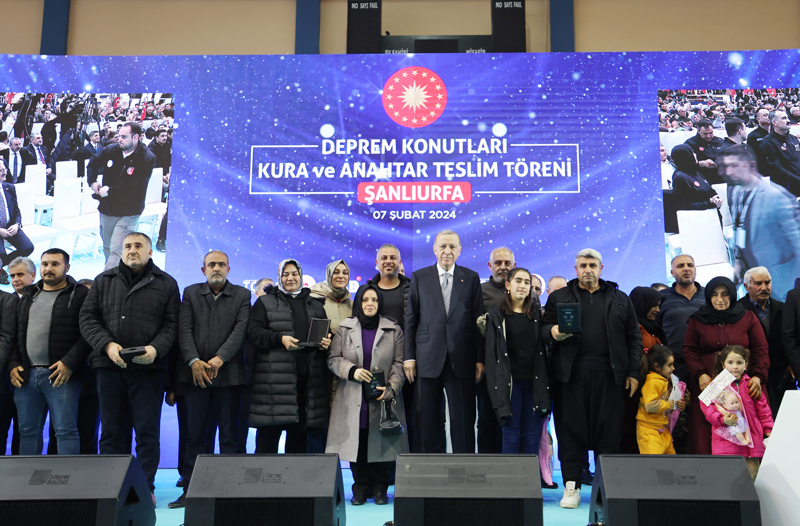 Bugünkü kura ve anahtar teslim töreninin devletin depremin yol açtığı yaraları sarma iradesinin en somut tezahürü olduğuna dikkati çeken Erdoğan, "Bugünkü törenimizle Şanlıurfa'da 1208'i il ve ilçe merkezlerinde, 106'sı kırsalda olmak üzere toplam 1314 afet konutumuzun kurasını çekiyoruz. Deprem konutlarının hak sahibi kardeşlerimize hayırlı uğurlu olmasını diliyorum. Şanlıurfa'da yaklaşık 4 bin konutumuzun yapımı hızla devam ediyor. Bunları en kısa sürede tamamlayıp hak sahibi kardeşlerime peyderpey teslim edeceğiz." dedi.