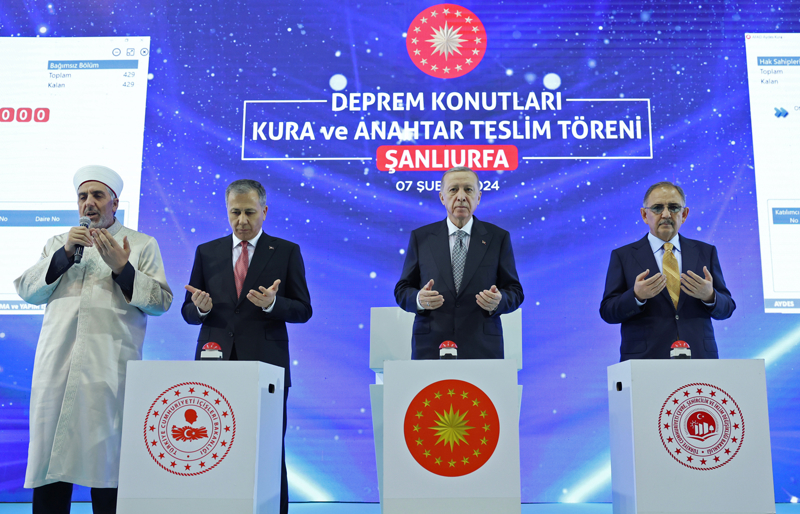 Cumhurbaşkanı Erdoğan, Harran Üniversitesi Spor Salonu'nda düzenlenen Deprem Konutları Kura ve Teslim Töreni'ne katıldı. Cumhurbaşkanı Erdoğan, yapılan duanın ardından Çevre, Şehircilik ve İklim Değişikliği Bakanı Mehmet Özhaseki ile butona basarak kura çekimini başlattı.