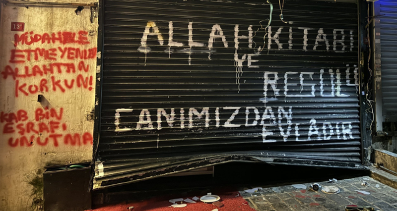 İş yerinin kapalı olan kepenklerini tekmeleyen gruptakiler, polis ekiplerince olay yerinden uzaklaştırıldı. İş yerinin kepengi üzerine olaya tepki amacıyla yazılan "Allah'ın kitabı ve Resulü canımızdan evladır" yazısı ise bazı kişiler tarafından silindi.