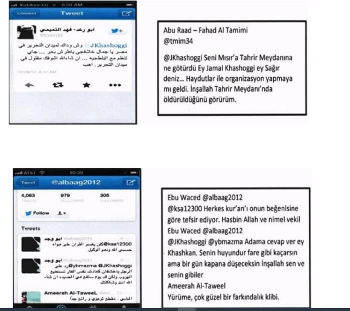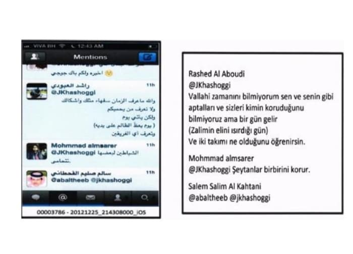 Cemal Kaşıkçı'ya ait laptop içerisinde bulunan fotoğraf dosyalarında Kaşıkçı'ya ait Twitter hesabından yapılan tehdit, şantaj ve eleştirilerin görsellerinin tespit edildiği, Suudi arabistan yönetimine eleştirel nitelikte yazılar yazan Kaşıkçı'dan rahatsızlık duyan bir kısım kişilerin tehdit içeren paylaşım ve yorumları tespit edildiği belirtildi.